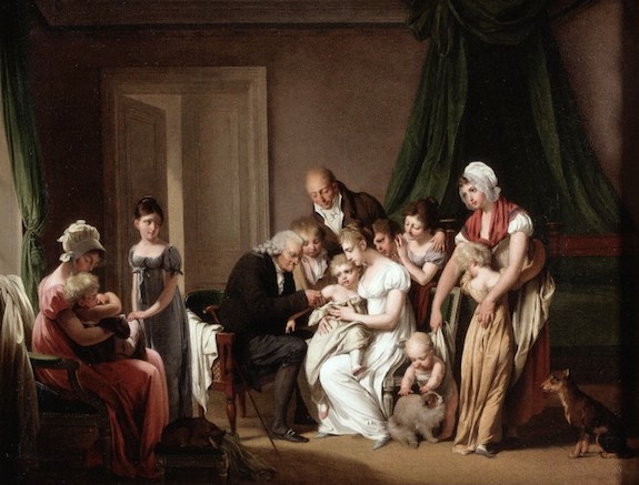 As far as my book is concerned, the painting is a little anachronistic in clothing styles and — more importantly — in showing vaccination rather than variolation). On the other hand, the procedure was pretty much the same, save that the “matter” the physician in the painting would have used was, after Jenner, the cowpox virus (vaccinia) rather than the smallpox virus (variola major). But the scene of an entire household gathering around a child as a physician performed the operation played out countless times from 1721 well into the twentieth century, when vaccinations moved to more clinical settings.