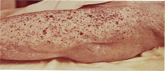 - The rash was a thick, velvety reddish-purple, which led to its folk-name of The Purples.
